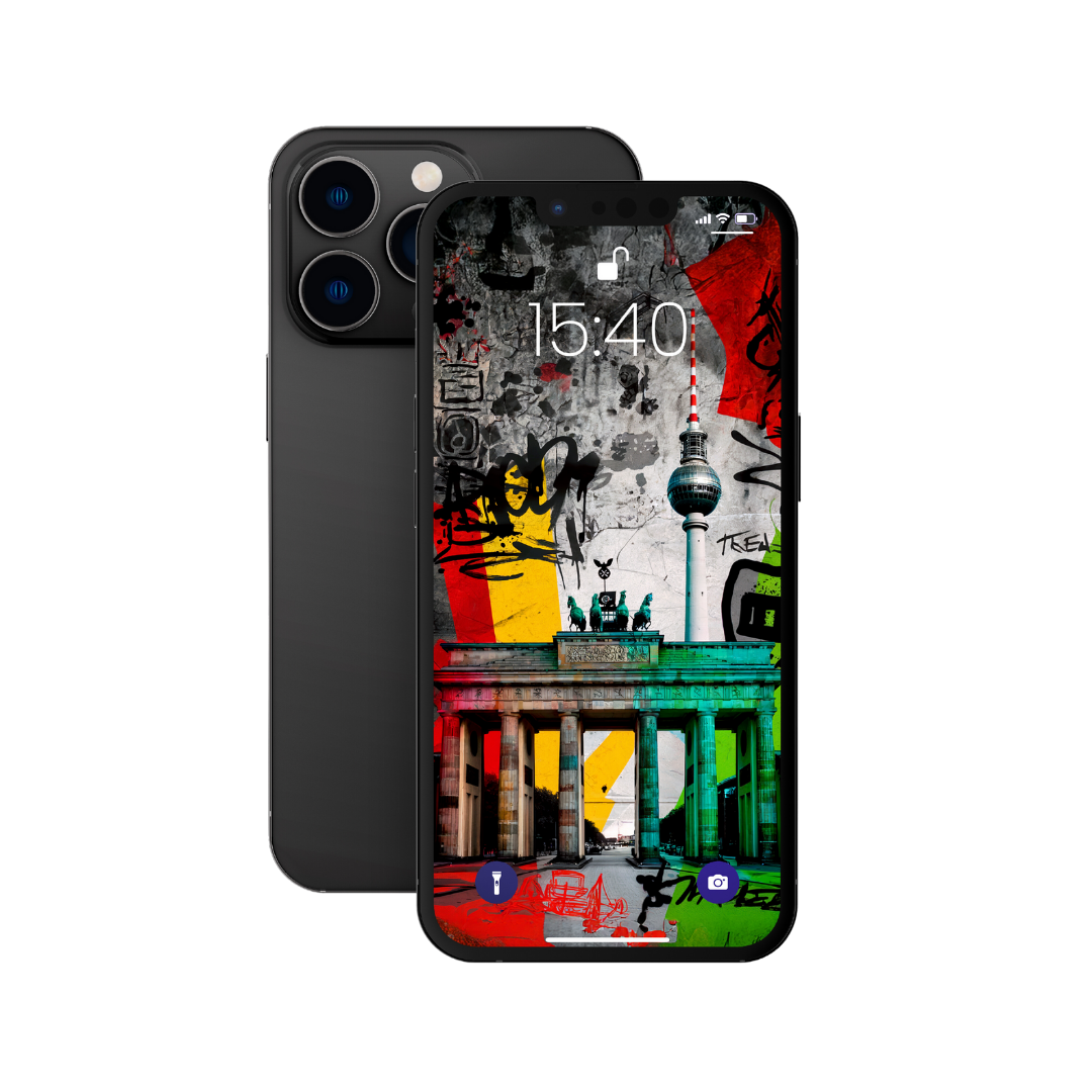 Celebrate Berlin's edgy charm with this vibrant street art phone wallpaper. Featuring the Brandenburg Gate and TV Tower amid bold graffiti and splashes of Germany's national colors, this design captures the city's dynamic blend of history and urban culture.