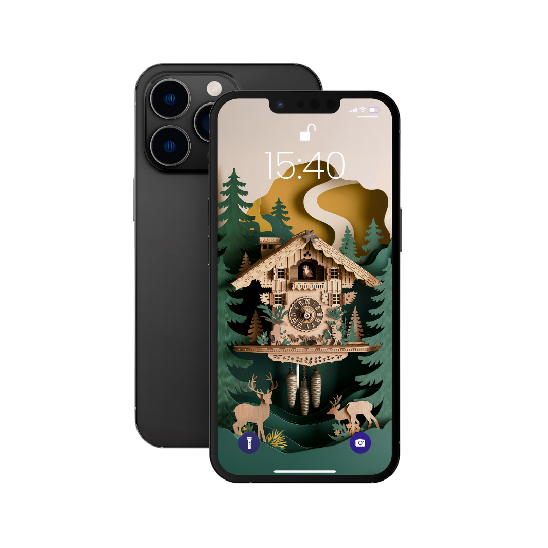 Capture the charm of German tradition with this papercraft-style phone wallpaper, featuring a beautifully detailed cuckoo clock nestled among evergreen trees and woodland deer. With warm, earthy tones and intricate artistry, this design adds a cozy, vintage vibe to your screen.