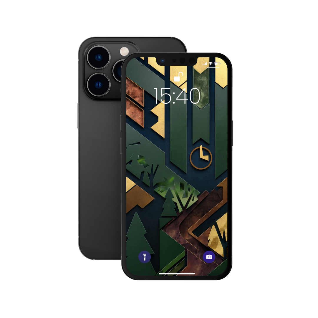 Embrace the mystique of the Black Forest with this geometric-inspired phone wallpaper. Featuring rich green tones, golden accents, and abstract forest elements, this design blends nature with modern artistry.