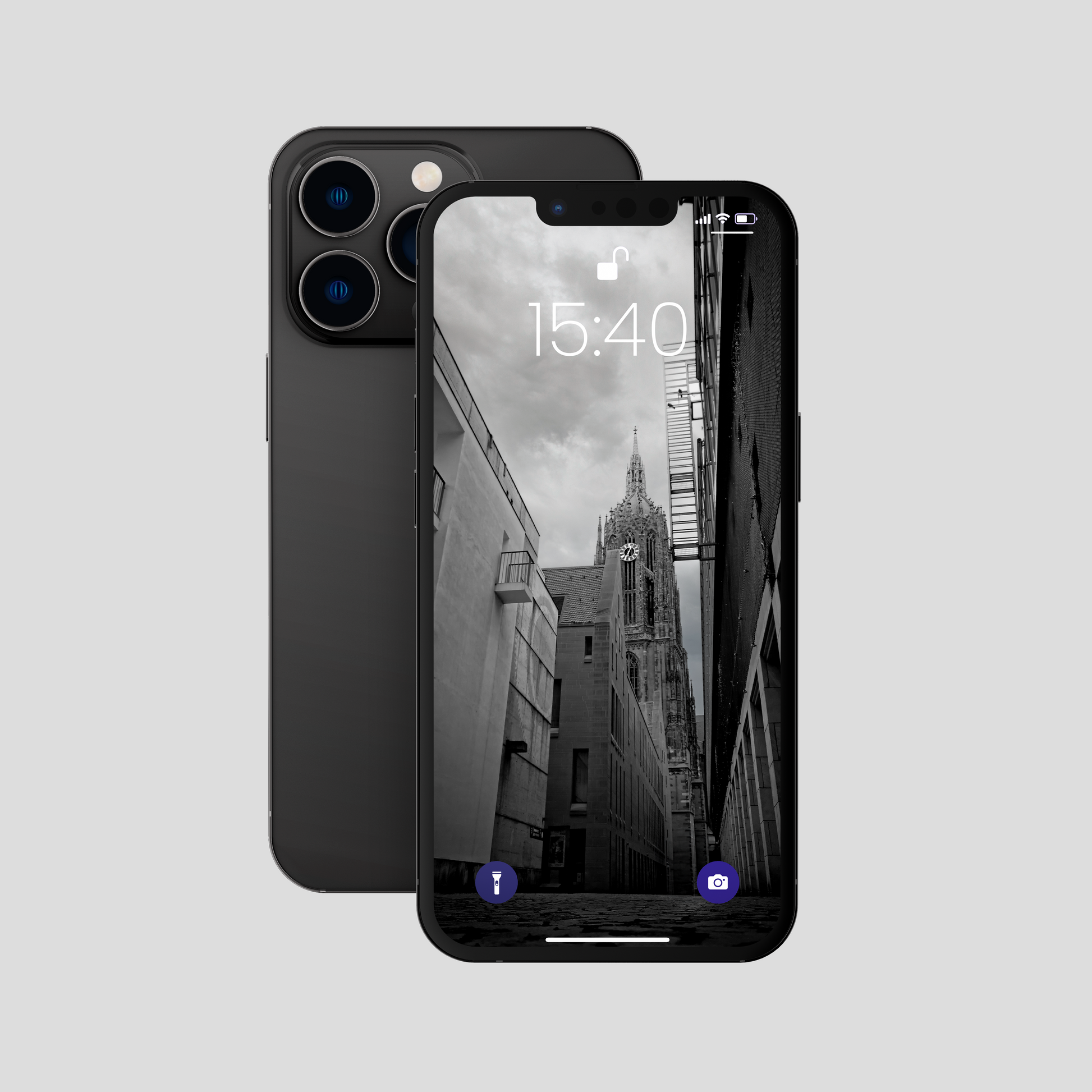 Immerse yourself in timeless architecture with this striking black-and-white phone wallpaper featuring the Gothic Frankfurt Cathedral framed by narrow urban streets. Perfect for lovers of history, architecture, and moody aesthetics.