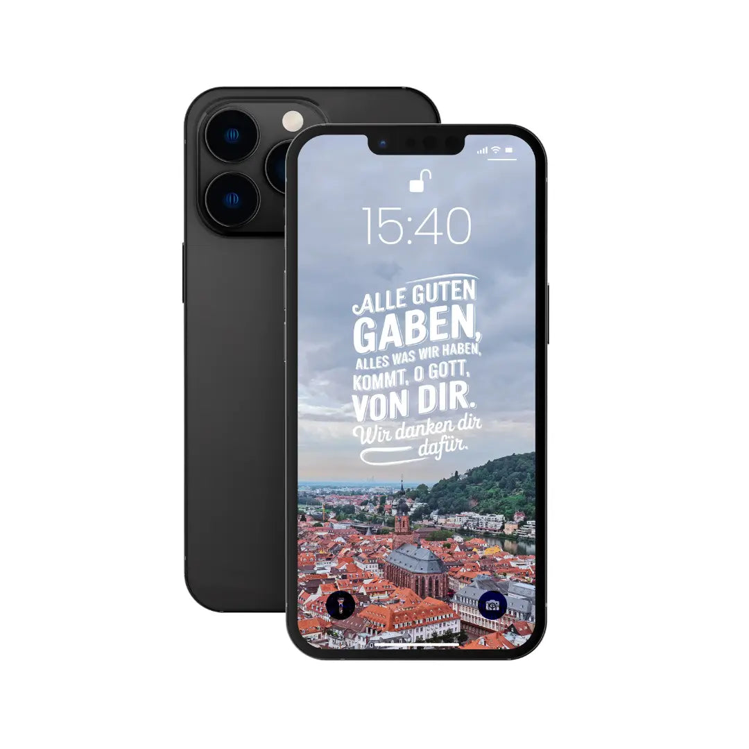 Carry a reminder of gratitude and faith with this elegant smartphone wallpaper. Featuring a traditional German table prayer over a stunning view of Heidelberg, this design is perfect for grounding your day in positivity and reflection.