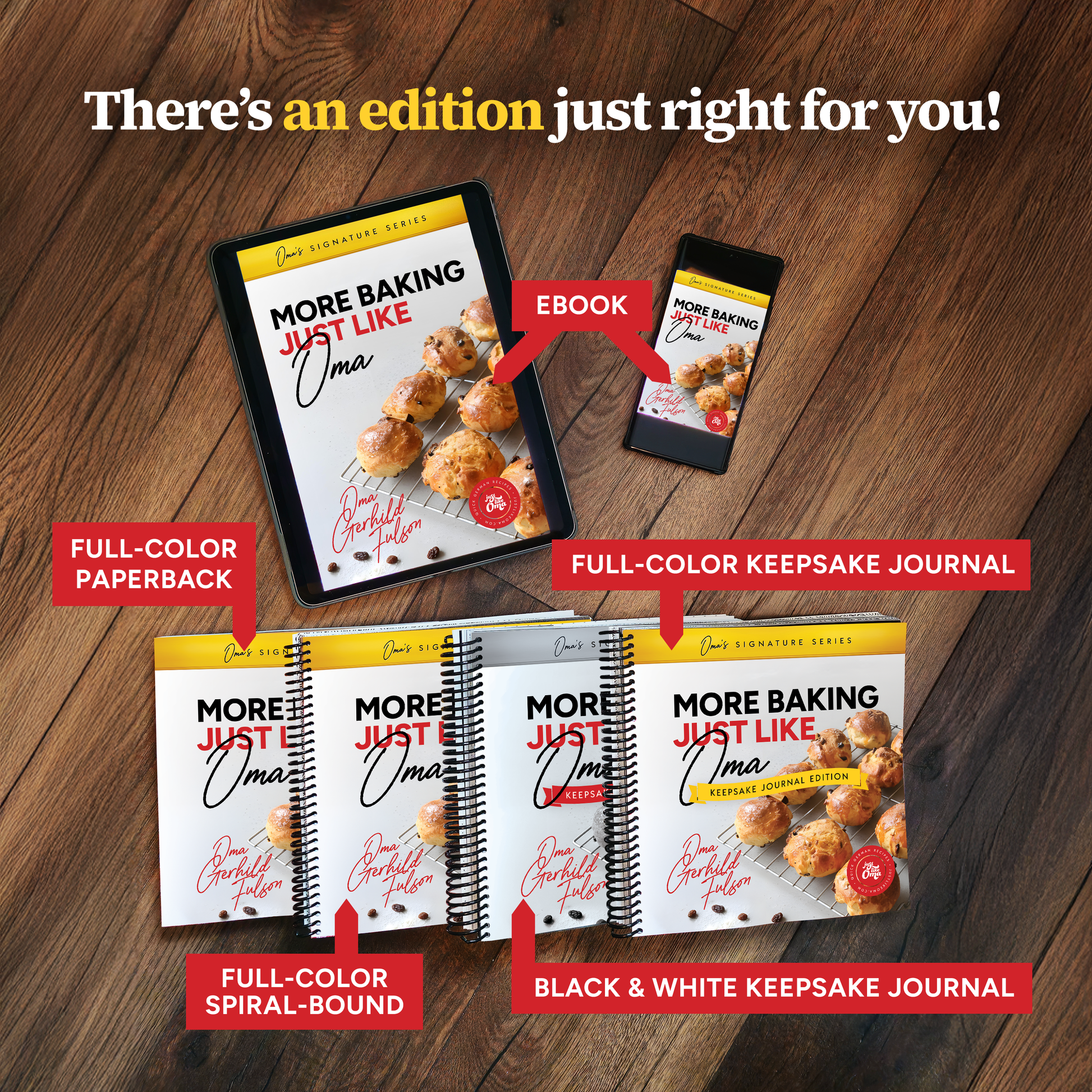 A Full-Color Keepsake Journal Edition is available with the same full color recipes and added features that let you personalize the book with blank recipe cards to add your own favorites, bookmarks for tracking notes, memory pages, and coloring pages with baking sayings to frame as posters.