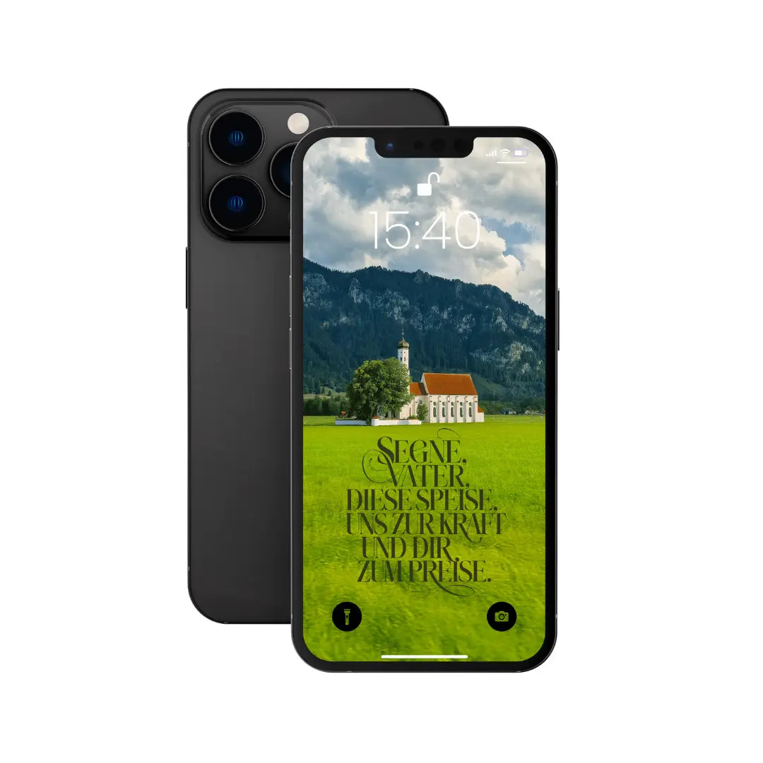 Infuse your day with gratitude and tranquility using this serene smartphone wallpaper. Featuring the traditional German mealtime blessing "Segne, Vater, diese Speise, uns zur Kraft und Dir zum Preise." over a picturesque view of St. Coloman Church against the Bavarian Alps, this wallpaper is a beautiful reminder of faith and reflection.